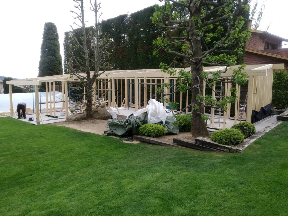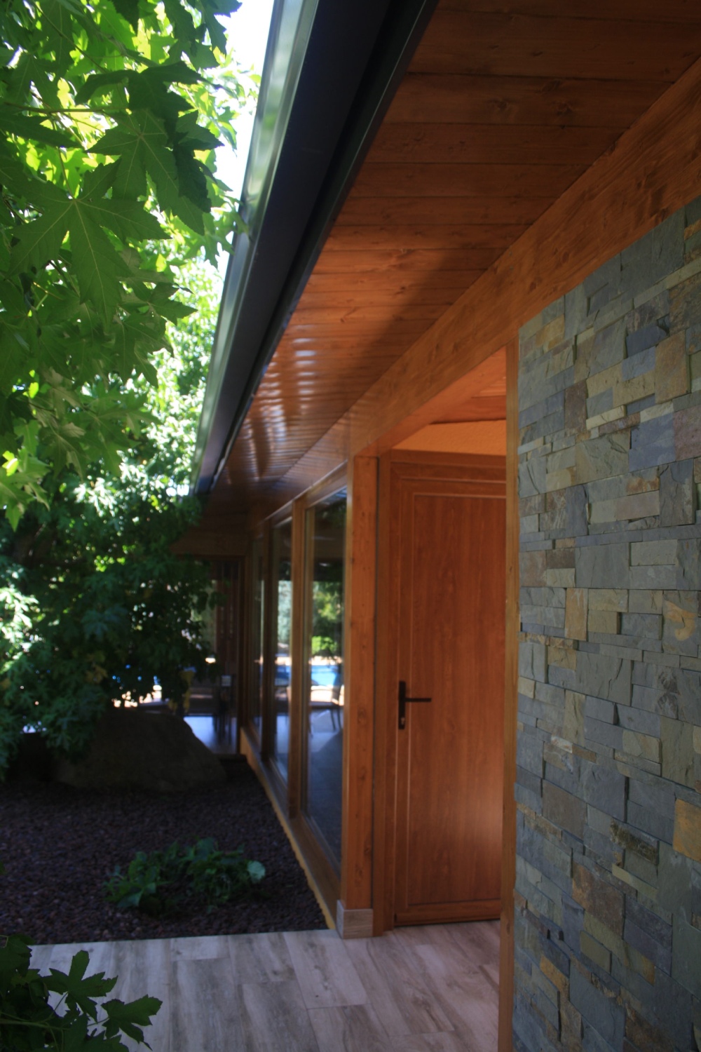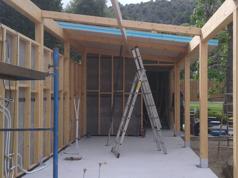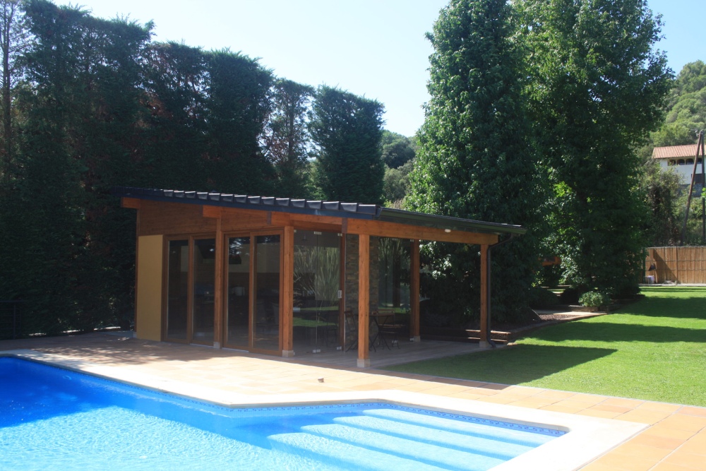El edificio se ha diseñado en forma de ‘L’ para intentar preservar el arbolado de la finca y adaptarse al resto de preexistencias de la misma, como por ejemplo la piscina. Para su construcción se ha considerado un entramado ligero de madera que potencia el diseño de grandes aperturas para disfrutar de las vistas al jardín, combinando los elementos de madera con revestimientos decorativos de piedra natural.