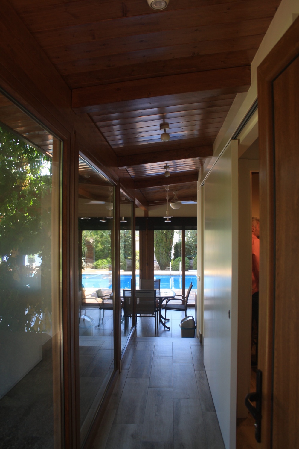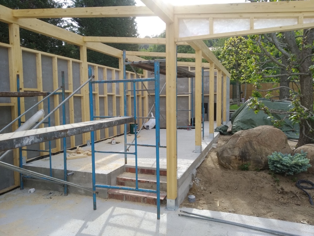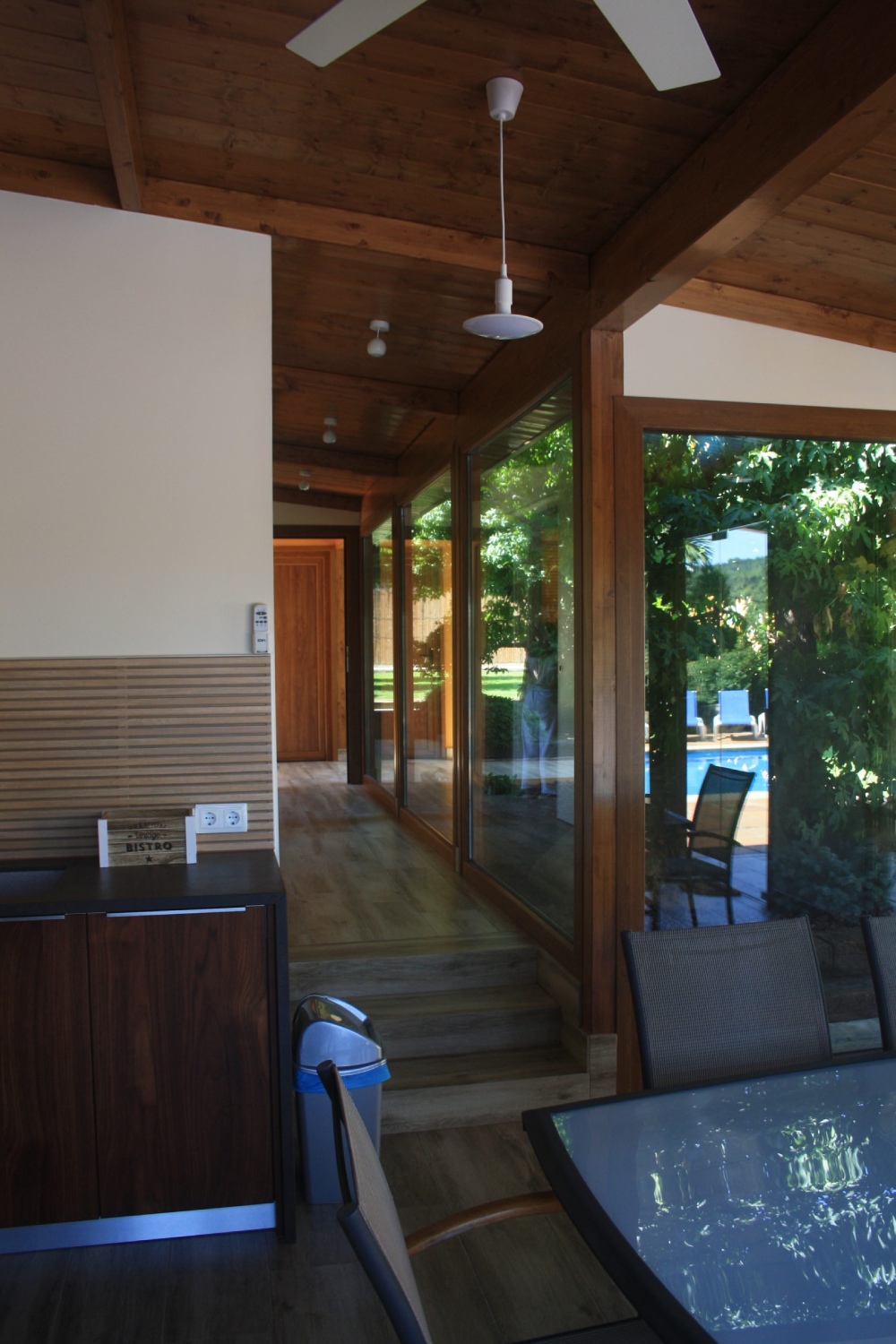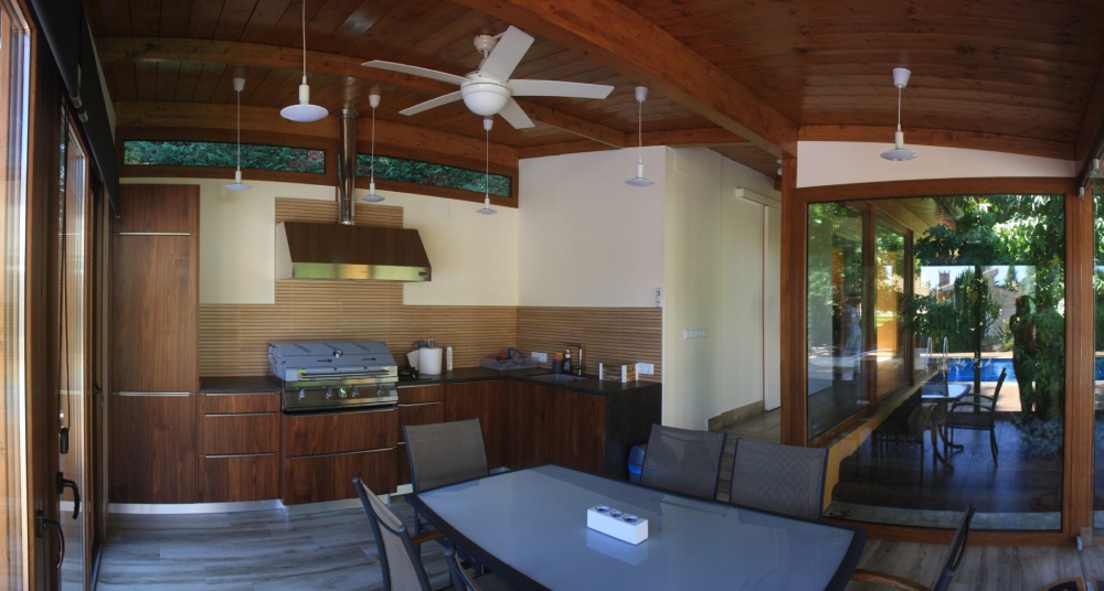 El edificio se ha diseñado en forma de ‘L’ para intentar preservar el arbolado de la finca y adaptarse al resto de preexistencias de la misma, como por ejemplo la piscina. Para su construcción se ha considerado un entramado ligero de madera que potencia el diseño de grandes aperturas para disfrutar de las vistas al jardín, combinando los elementos de madera con revestimientos decorativos de piedra natural.
