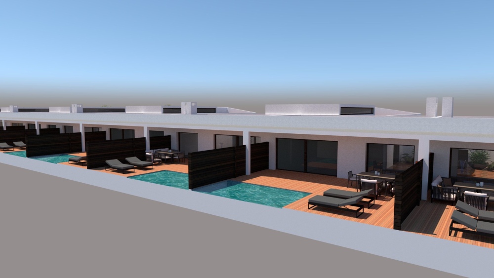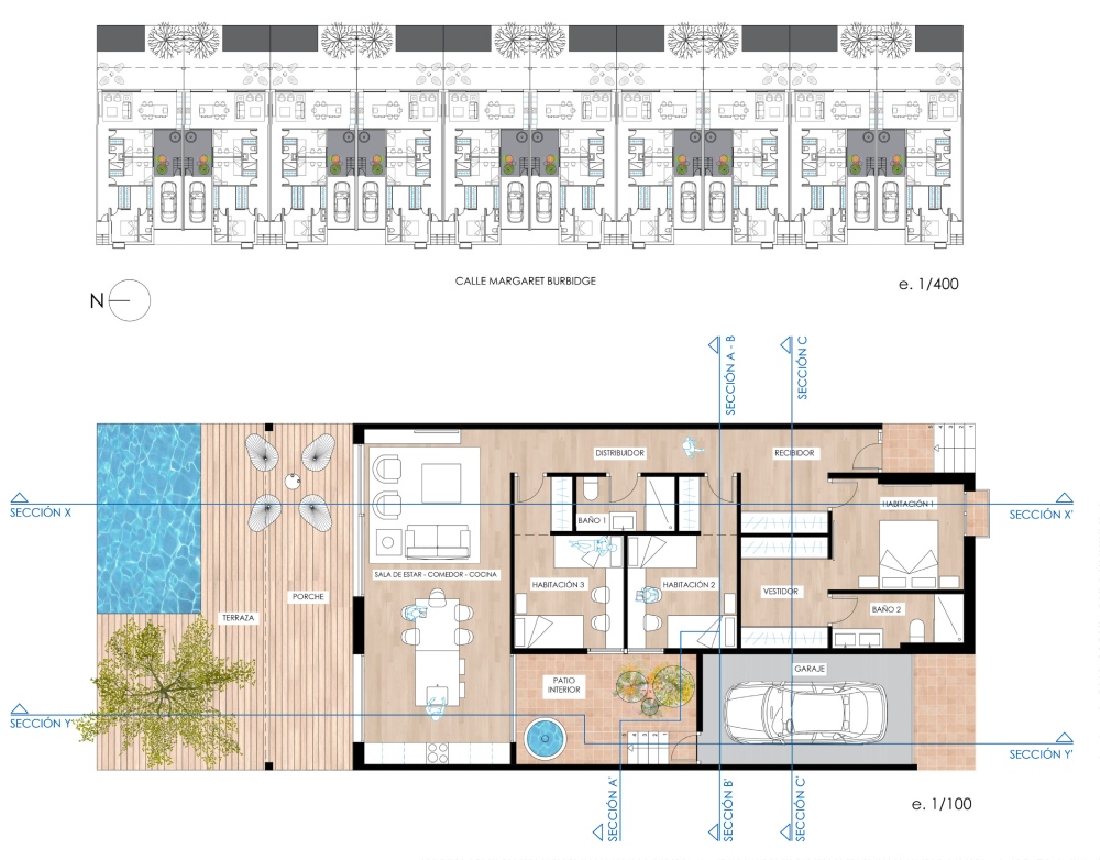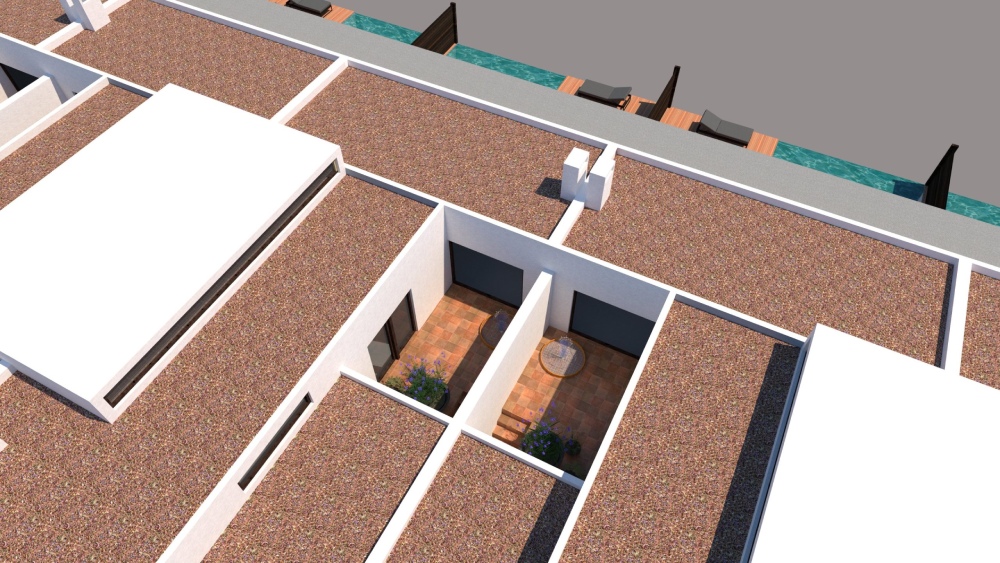 Las viviendas, estructuradas en una sola planta, organizan el programa habitable alrededor de patios interiores con fuentes de agua. Estos espacios, que aparecen como el corazón de las viviendas, aportan distintas ventajas: a parte de dar luminosidad a las estancias, la combinación del agua y la vegetación del jardín contribuyen a generar un microclima más fresco a la casa en estaciones más calurosas.
